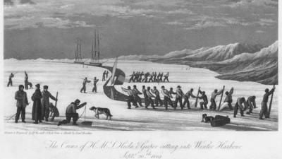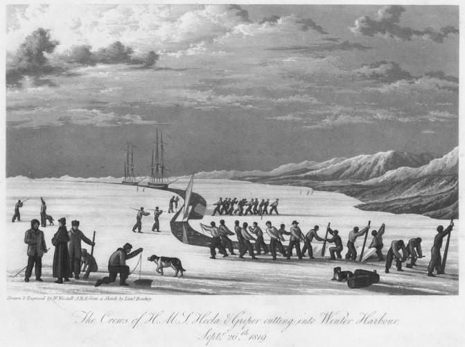 Spurred on by the reward, and the belief that the Northwest Passage could be navigated before the end of the season, the two ships ploughed on. As they progressed the strait became harder and harder to traverse, large sheets of ice increasingly blocking the path. After a small scientific excursion to the coast, Griper became stuck in the ice, trapped between the shore and a large ice floe that threatened to crush her. Parry began to make preparations for the removal of the crew and vital supplies, but thanks to the determination of Lieutenant Liddon they were able to extricate her. With navigation proving ever more perilous to the west and ice beginning to form on Hecla’s rigging, Parry took the decision to turn east and seek out winter quarters.13 Winter approached far sooner than was expected and Hecla and Griper were forced to proceed eastwards as quickly as possible for fear of becoming trapped in the ice. In the search for a safe place to set anchor and wait out the long dark winter in the Arctic, Parry steered a course towards the south coast of Melville Island. Once again encountering a solid mass of ice blocking their way, with no other way to turn, the two crews set about cutting their way through towards what had been dubbed Hecla and Griper Bay. Having worked out a route the officers and men used saws to cut two parallel lines in the ice before cutting across and creating smaller and smaller slabs that could be pushed aside. In three days the two crews had created a canal nearly two and half miles long through seven inches of ice without incident.14 By 26 September Hecla and Griper successfully anchored at Winter Harbour. In the fierce Arctic winter, this harbour was to be Hecla’s home for the next ten months.