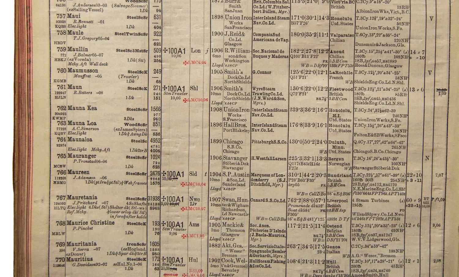 By the 1910s, the first Diesel engines were trialled at sea, with convincing results that stirred investments towards the introduction of motor vessels. Developments in refrigeration technology meant that perishable food cargo, such as meat and fish, could now be shipped from one continent to another. These changes contributed to refinements and additions to the information contained in the Register Books. The new editions consisted of two volumes, one for the sailing vessels, thinning year by year, and one for the steamers.