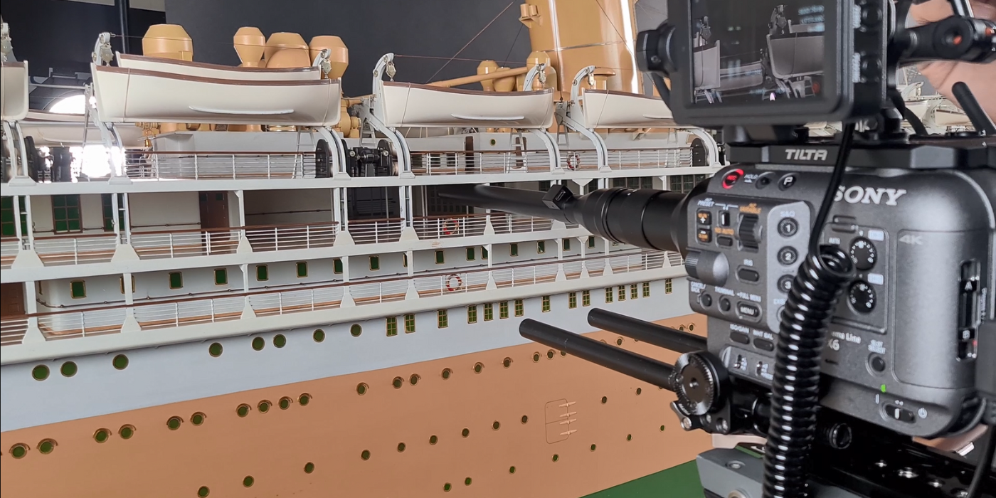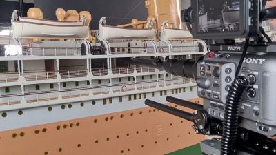 Each model took around four hours to film and each posed a slightly different challenge: Vengeance has all the complexity of a Victorian warship, with rigging, a huge variety of guns and ships’ boats with little space anywhere on deck; Orion as a passenger liner from the 1930s has far more space but far more opportunities to be creative with camera and lights. The resulting films are spectacular and we are enormously grateful to the staff at the Dock Museum for their interest and enthusiasm from the very start of the project, but also on a long and testing day’s filming.