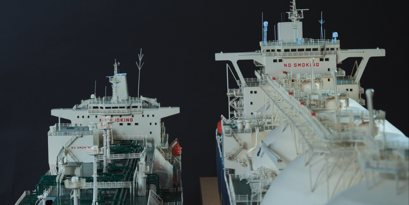 This pair of miniature models of Liquified Natural Gas (LNG) carriers showcases innovative approaches to transporting LNG by sea, a low-carbon fossil fuel.