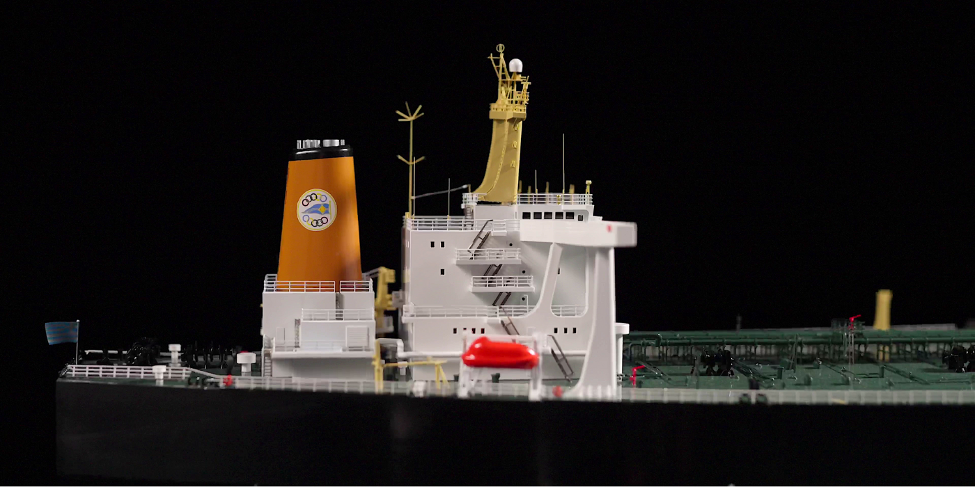 This is a model of the crude oil tanker Olympic Loyalty, launched in 1993 and built in the Oppama Shipyard in Japan by Sumitomo Heavy Industries. With a length of 332 metres and a gross tonnage of 160,129 tons she is classed as a supertanker - designated as a VLCC - very large crude carrier. At the time of her launch she was one of the safest oil tankers ever built, an innovative benchmark in the industry, one of the leading ships of a new era of oil tankers.