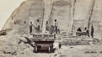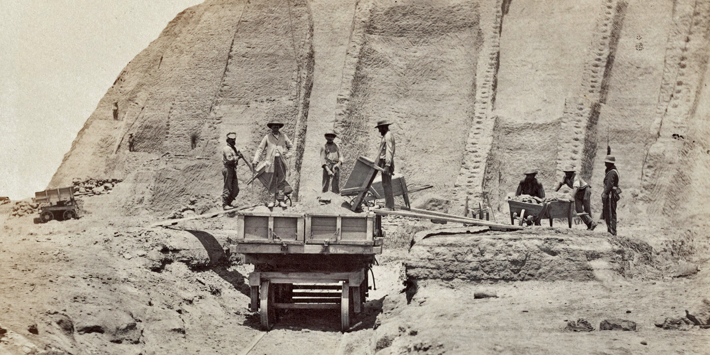 In the intense heat, the digging and loading of guano, including the trimming of the cargo, were done by slave labour and later on by local Indians, convicts and thousands of indentured coolie labourers (effectively slaves, mostly from south China). Loading methods varied over time and in different locations and took up to three months, including a great deal of waiting. The first task was to remove much of the ship’s ballast. It was replaced with guano, which was brought to the cliff edge in wheelbarrows or rail trucks and tipped into boats or lighters, filling bags or sacks that were hauled aboard the merchant ships and down into the hold. Bags of guano were also stacked up the sides of a vessel as an additional protective lining.8