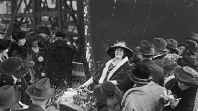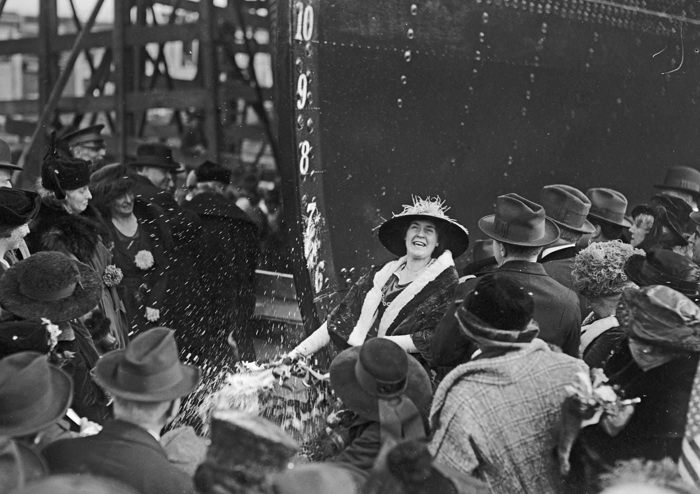 Under the figurehead was a railed-in platform, intended for the lady and the party with her who were to perform the ceremony ... The lady who was to christen her, repeating a certain formula (which I have forgotten), revealed to the many listeners the hitherto-concealed name. At the same time she swung the bottle towards the ship with intent to break it and spill the wine over the bow. But alas! Unnerved perhaps by the shouting of the carpenters ... the lady lost her head and pulled the cord with insufficient force. The bottle swung back without touching the ship, still intact, its mission unfulfilled. This was a disastrous thing to happen. It was an omen of the very worst kind. 25